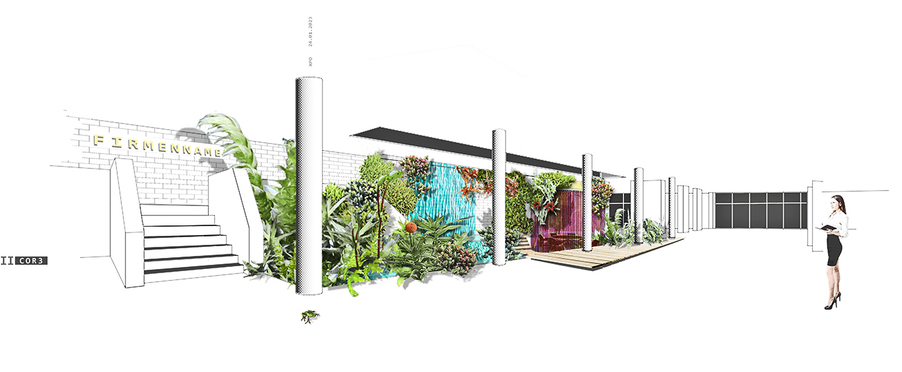 Die Gewerbeeinheit mit ca. 1000 m² Netto-Raumfläche erstreckt sich über das komplette Erdgeschoß. Die Grundfigur der Fläche ist ein Trapez, wodurch eine ungleichmäßige Gebäudestruktur entsteht.