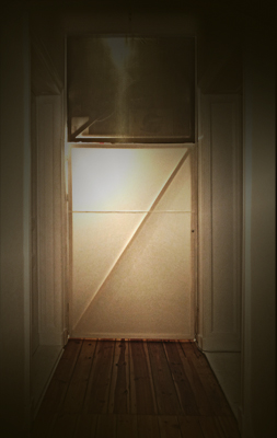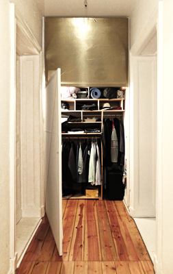 Die Restfläche am Ende des Flures wird zur Gaderobe. Und darüber, ein Stauraum für Sonstiges.Material: Latten, Stoff, Leuchte