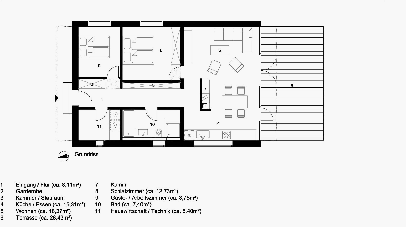 Entwurf für ein kleines Ein-Personen-Haus im Low-Budget-Bereich auf einem kleinem Grundstück.