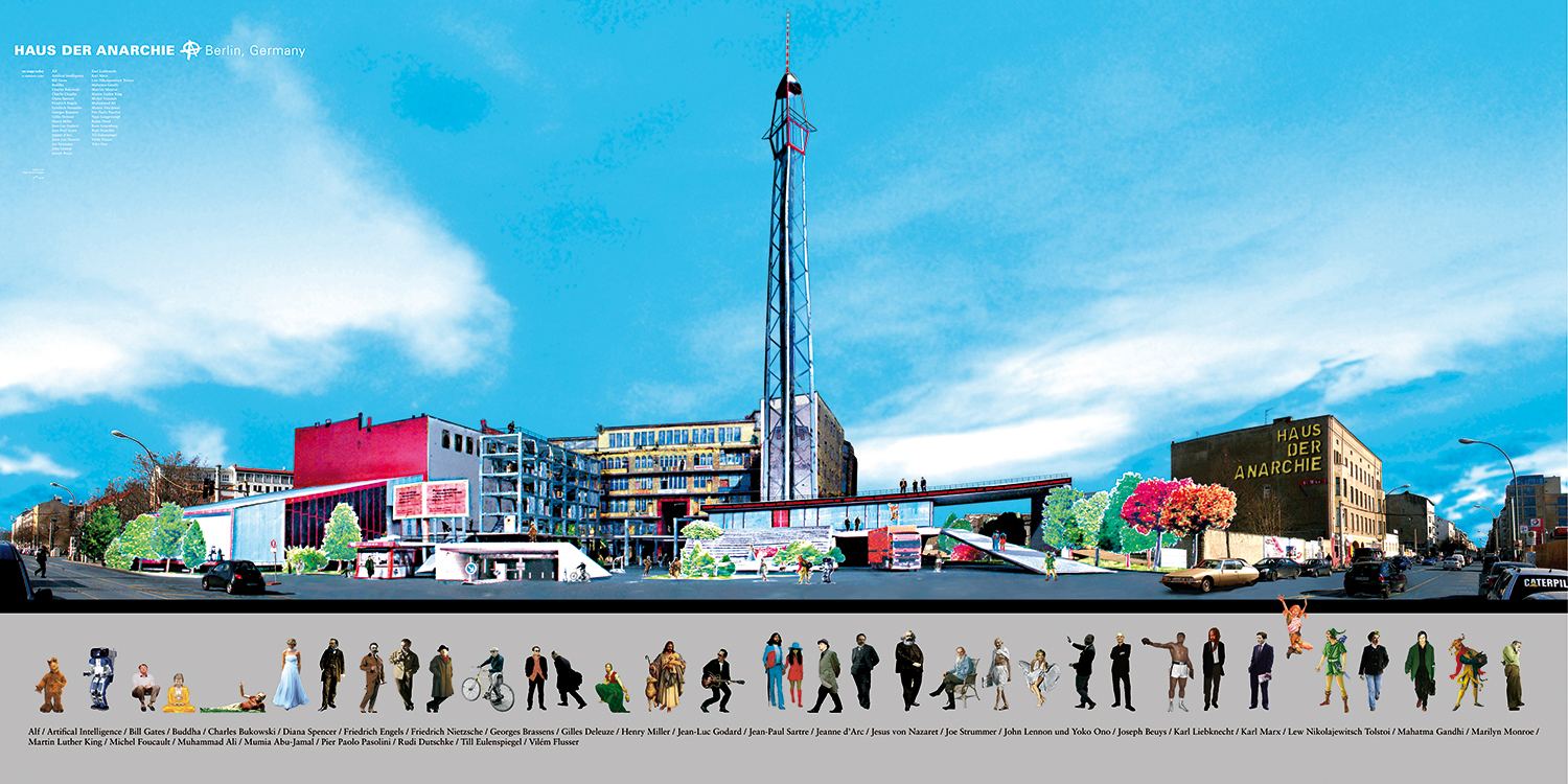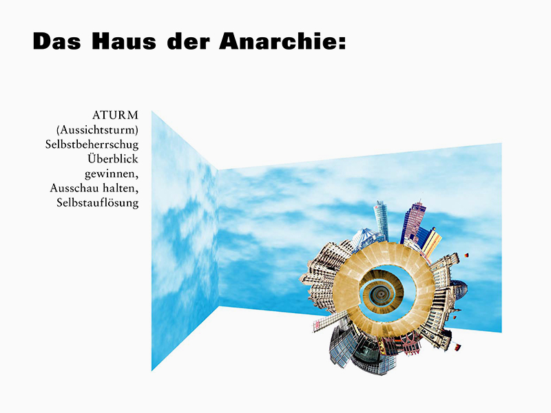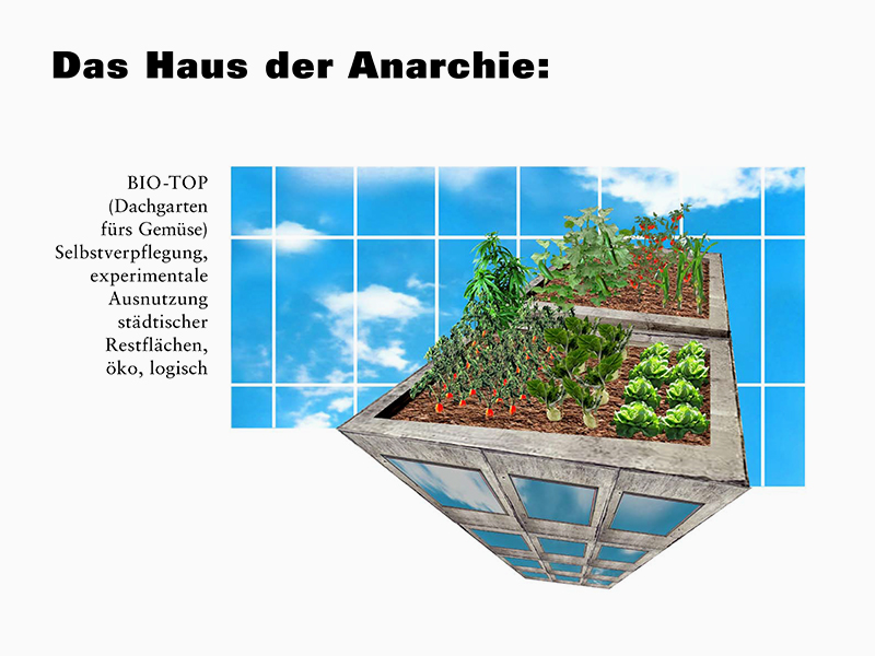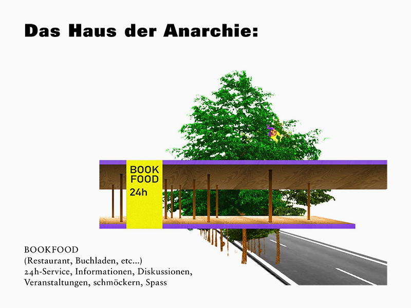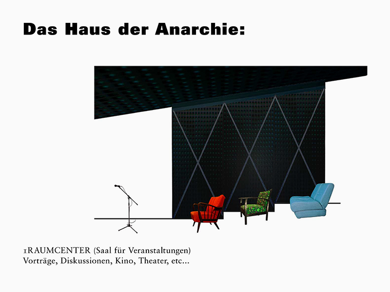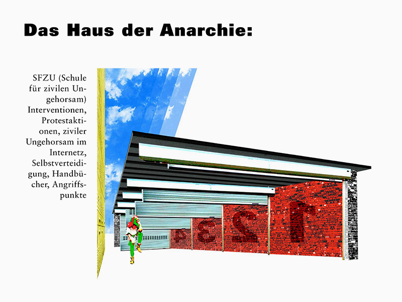 Dazu nimmt es eine Reihe von unterschiedlichen Funtkionen auf, z.B. Mulitfunktionsaal, Bibliothek, öffentlichen Ausstellungsflächen, Schule für zivilen Ungehorsam, Gästehaus, Wohn- und natürlich Arbeitsräume.