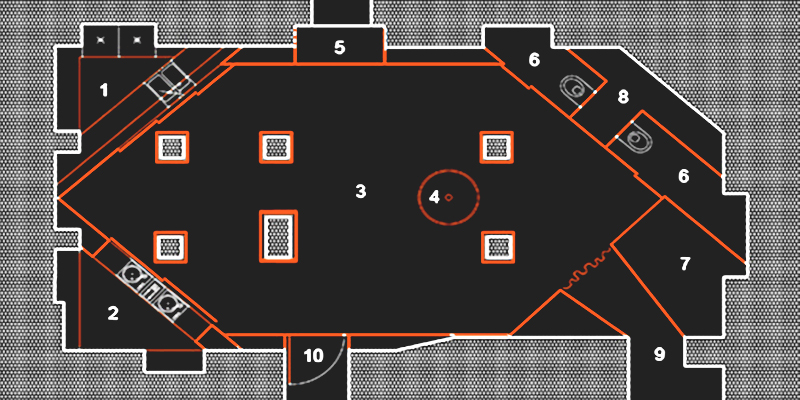 1 Bar2 DJ3 Tanz4 Waschbrunnen5 Nische6 WC7 Lager8 Installation9 Zugang10 Keller
