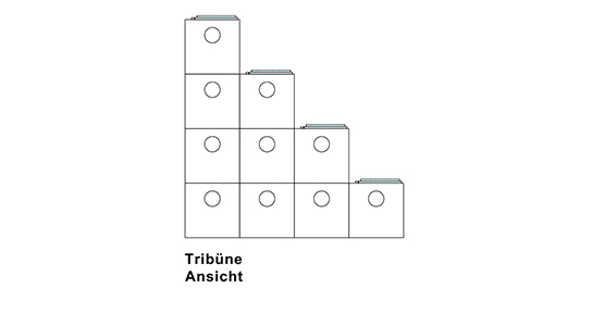 Raumbildendes Möbelelement zur Ausstattung von zum Beispiel Veranstaltungs- oder Ausstellungsräumen. Stapelbar zu Wandscheiben, zu Tribünen – arrangierbar zu Liegeflächen, zu Sitzreihen, als Einzelsitze.